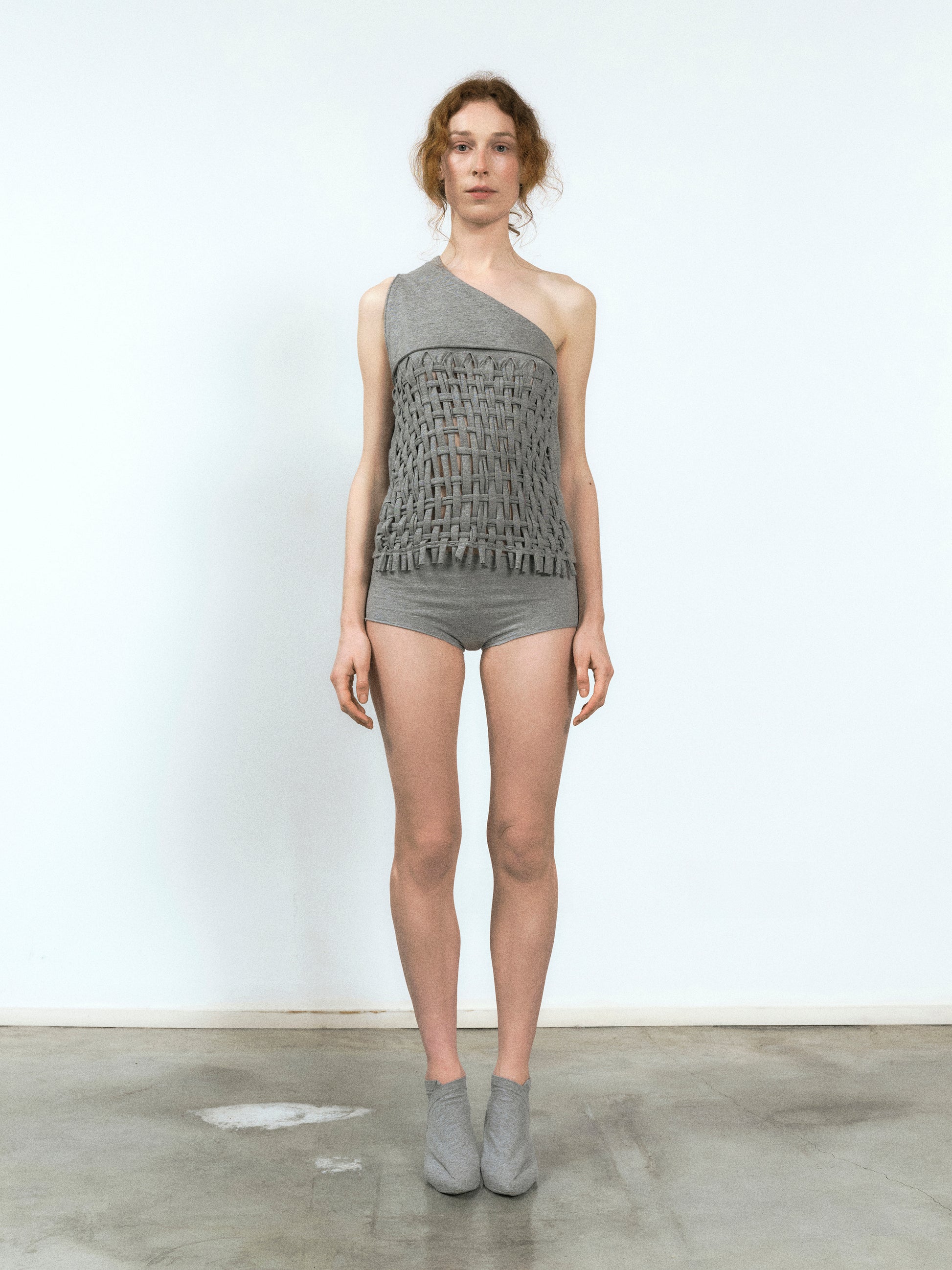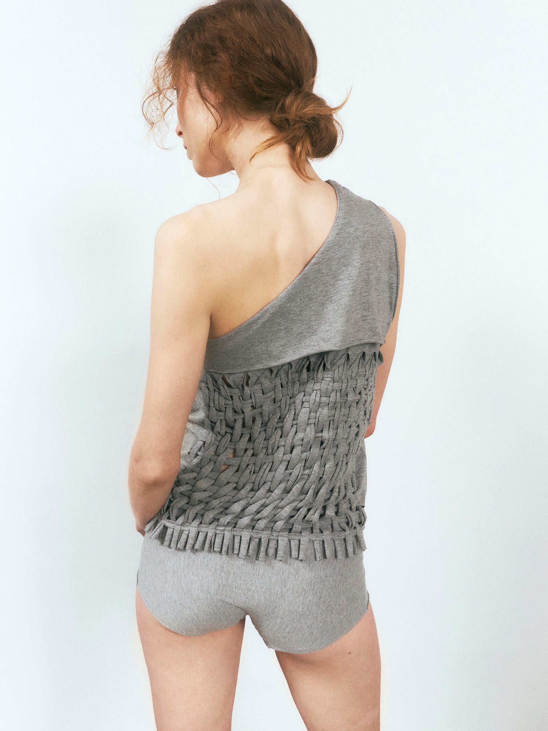 It is transformed through an intricate weaving process, intertwining each t-shirt with the other.
