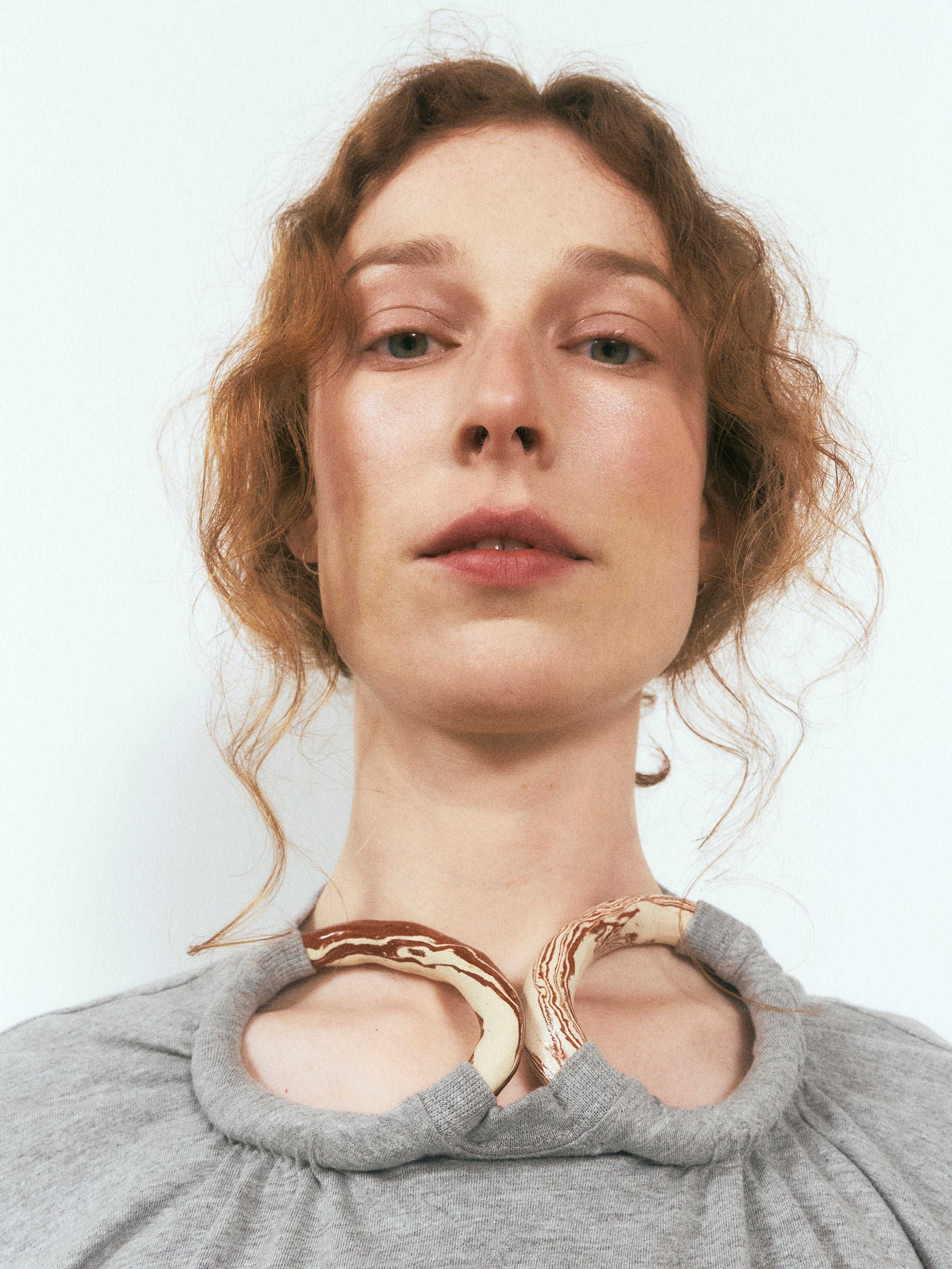 It is transformed through adding the ceramic rings on the neck line, blending textile with ceramics.