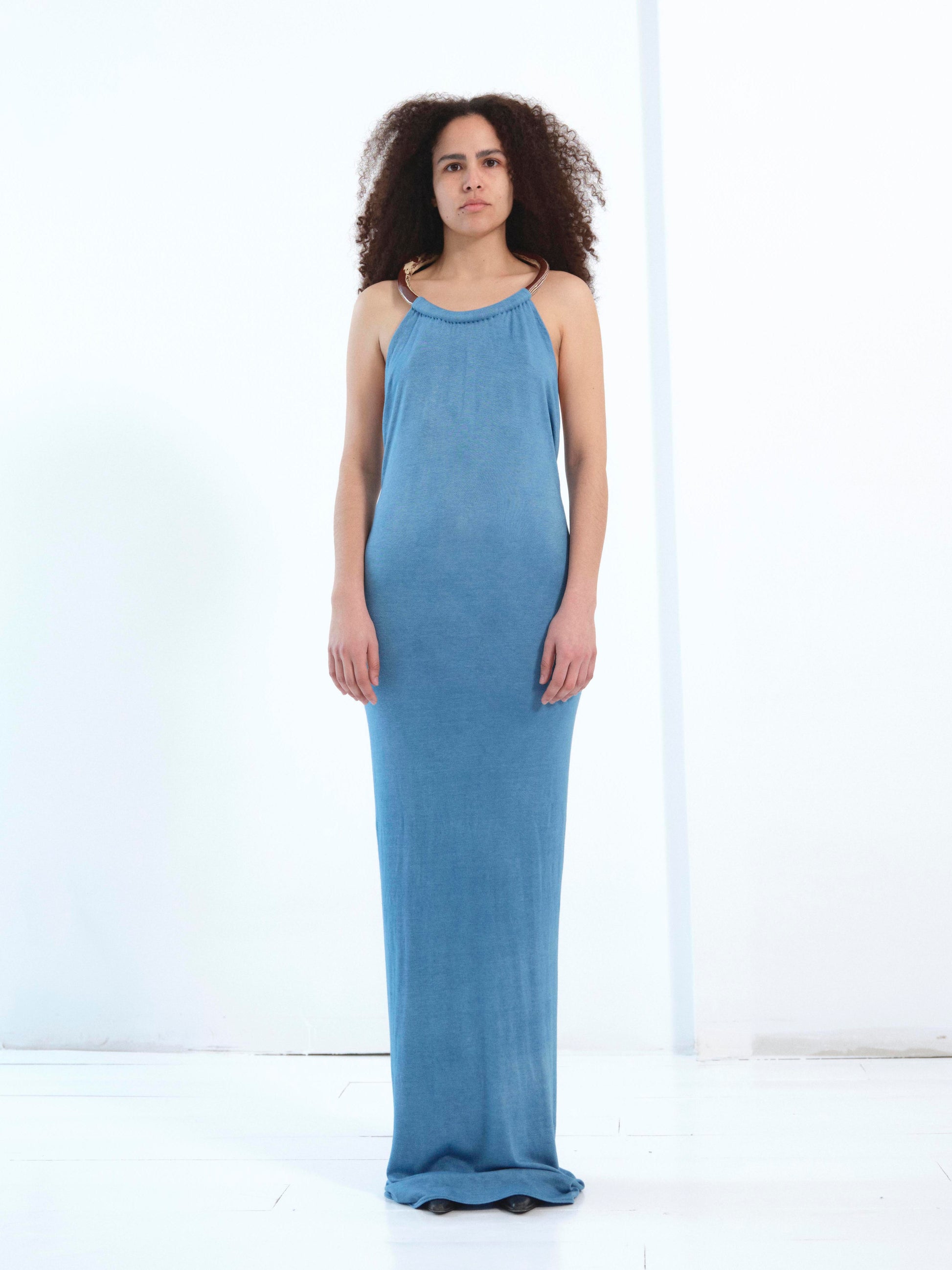 Handcrafted dress featuring a bold ceramic ring, designed to suspend the garment from the neck. The dress is slipped over the head, allowing the large ring to rest at the neckline, draping effortlessly over the body. It gently embraces the sides while cascading open at the back, creating a fluid silhouette. Made from deadstock cotton fabric, hand-dyed with natural indigo. The ceramic ring is meticulously crafted using the nerikomi technique. Designed for versatility, the dress includes removable sleeves that can be reattached. Due to the delicate nature of its materials, careful handling is advised.
