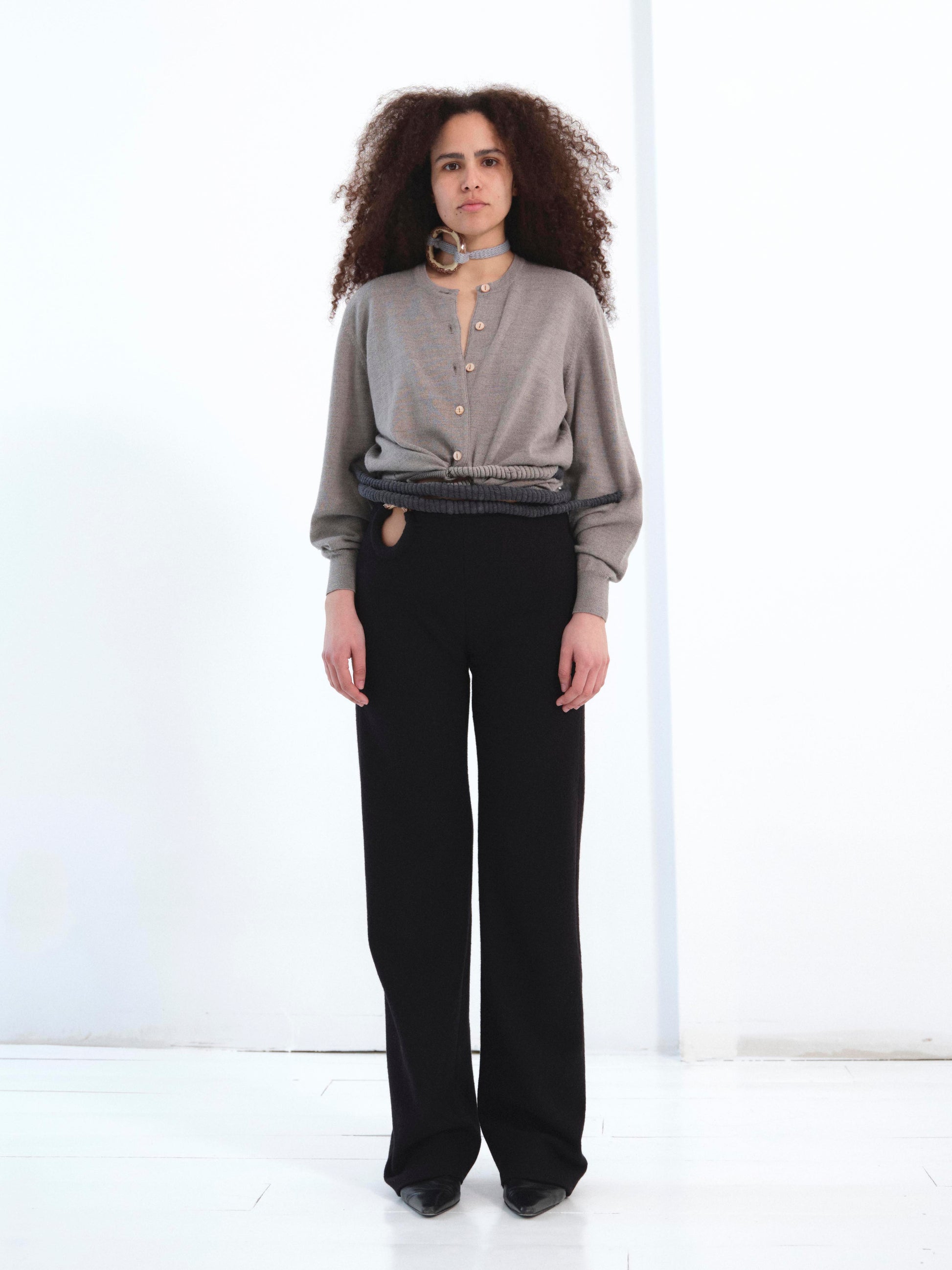 The cardigan is reimagined from a second-hand cardigan and deadstock fabric. The design features two fabric tails, crafted using a technique inspired by tie-dye, the fabric is tightly wrapped with strong, resistant thread. These tails emerge from each side of the bottom hem, creating two belts that wrap around the hips and fasten with pressure buttons. Each piece is one of a kind, as it is made from a curate second-hand garment.