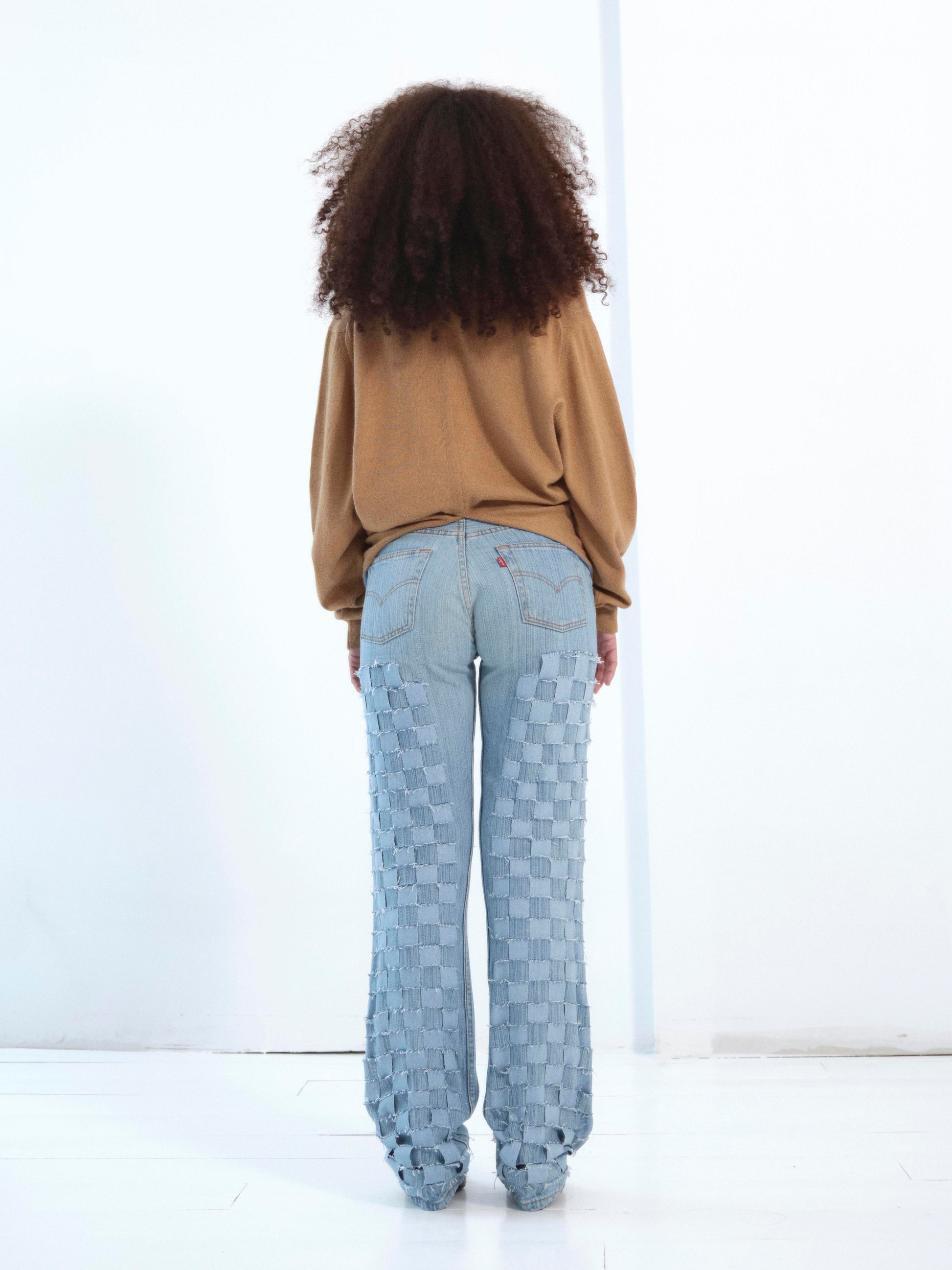 The sweater is a reimagined version of a classic knit sweater, transformed through a unique twisting technique that redefines its original shape. Crafted from a curated second-hand sweater, making each piece one of a kind. The transformation process gives the garment a distinctive, sculptural silhouette.